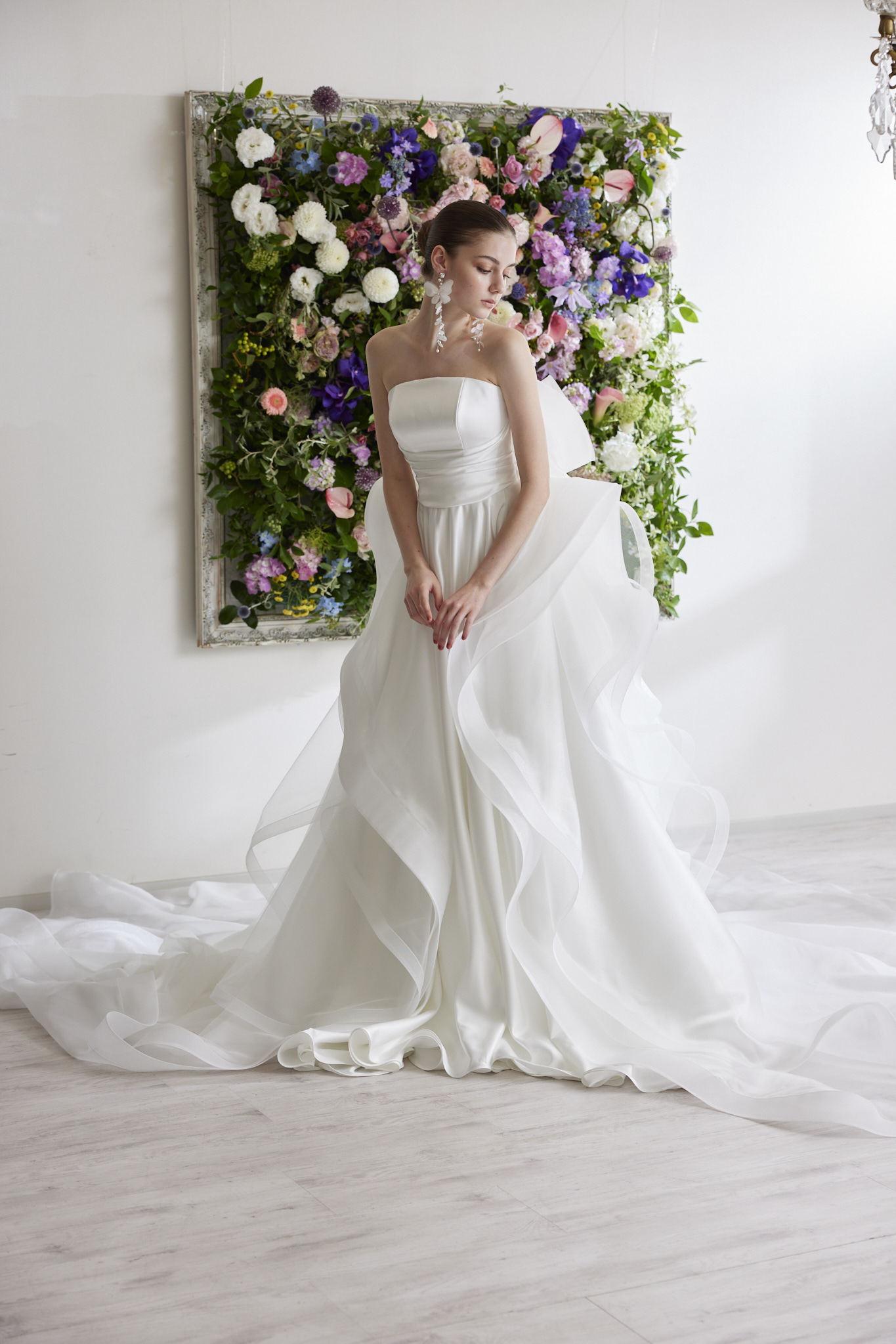 | サテンの上品な輝きとドレープ感がとっても美しく、うっとりしてしまう優雅さを漂わせたフェアリーAラインドレス。 数種類の透け感や厚さの違う軽やかなオーガンジーと透明感あふれるチュールをミックスした独創的かつ立体的なバックトレーンがエレガントな流動美を感じさせます。 ハリ感と、ほんのり上品に白く輝くメッシュ素材やサテンオーガンジー、キラキラと美しく光り輝くホログラムチュールなど数種類の白を混ぜ合わせたトレーンは、それぞれの素材の輝きが重なり合い、壮大な立体感と美しい陰影を描き出しております。 柔らかでヒラヒラとなびく花びらをイメージしたフラワートレーンと、上品で洗練されたドレープ感が美しいサテンドレスのコントラストが、より一層エレガントな女性の美しさを引き出し、可愛らしさと美しさを兼ね備えた妖精のようなドレスに仕上げております。 |
