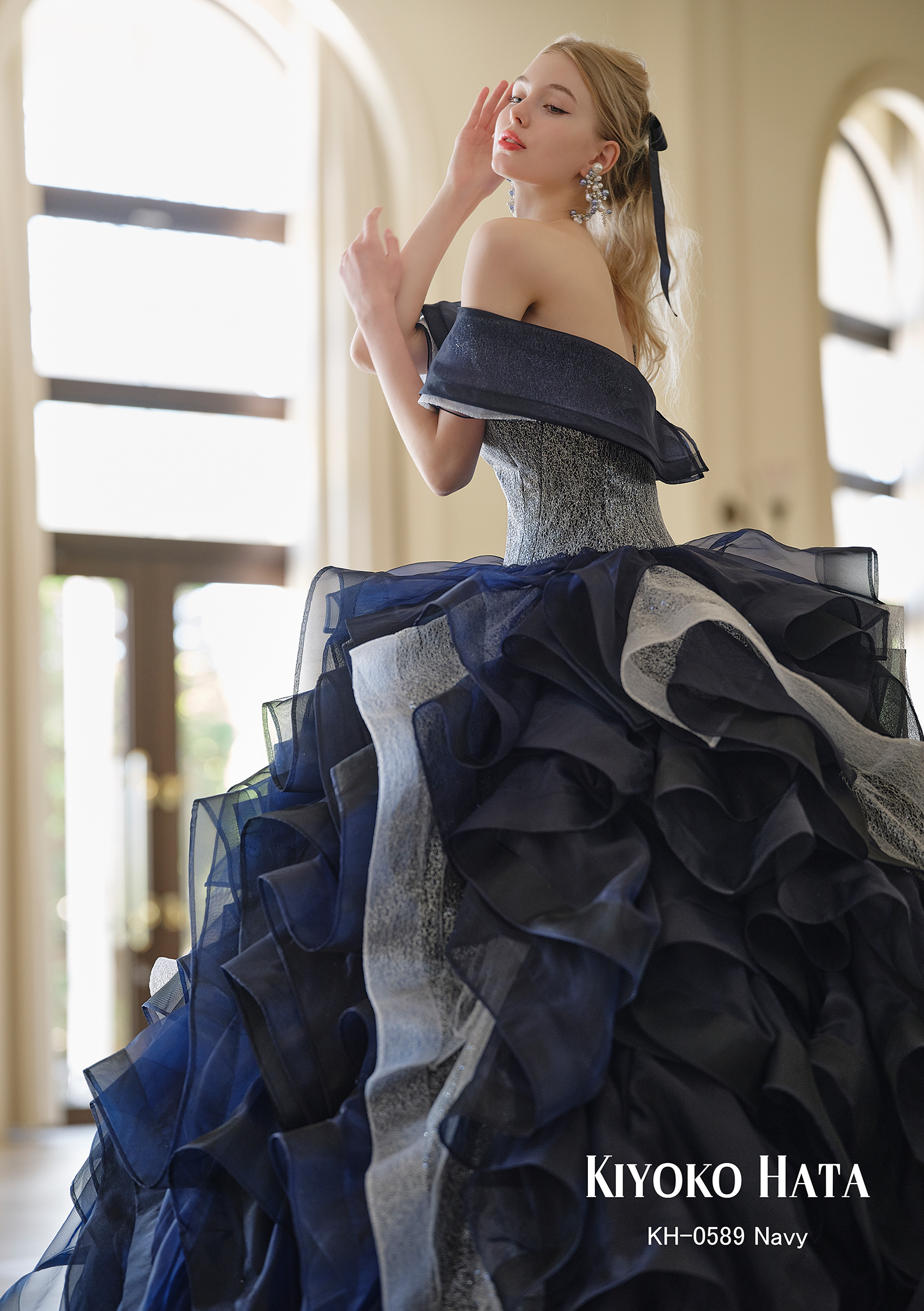 | 空気を含むように軽やかに重ねられたオーガンジーのフリルが波のような立体感を生み出すボリュームドレス。 動くたびに揺れるフリルの陰影に、繊細なラメがやわらかく煌めき、優雅で華やかなシルエットを描きます。 ビスチェはグリッターを忍ばせた立体感のある仕立てで、オフショルダーが上品にデコルテを演出。 ネイビーは気品と知性を宿した印象的な色合いで、特別な日にふざわしい存在感を放ちます。 |