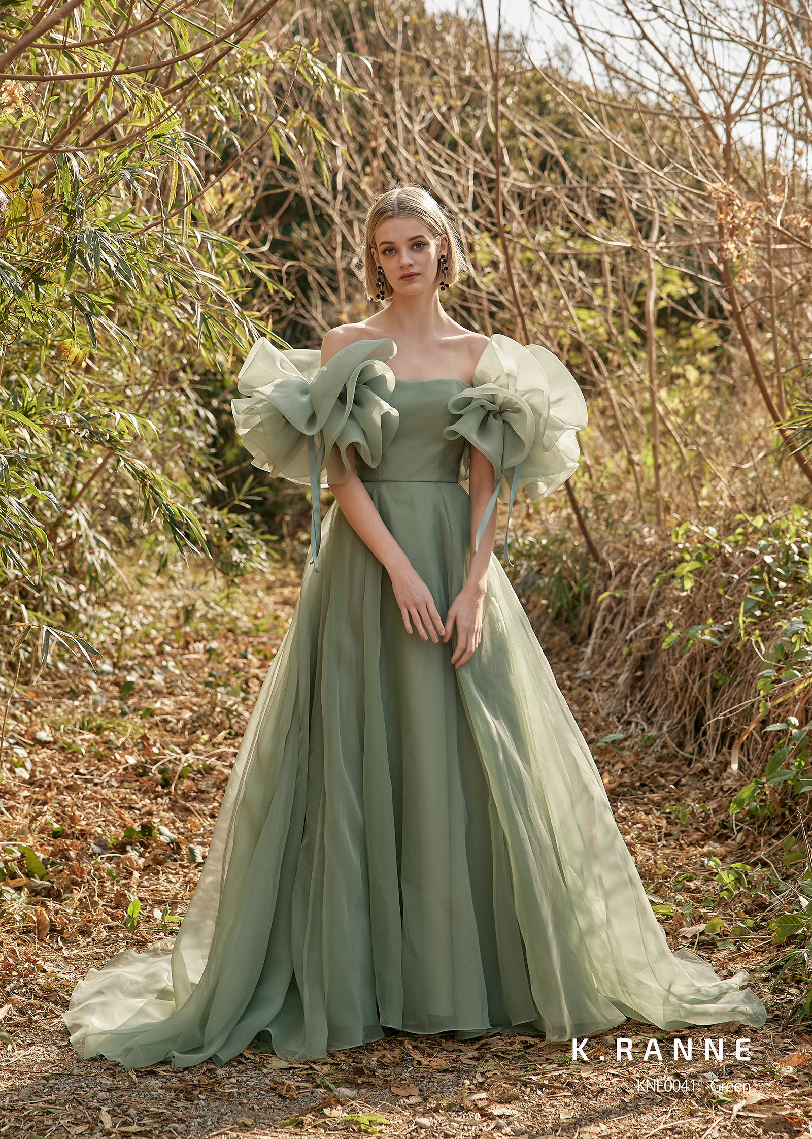 | オーガンジーのふわふわの袖に細リボンのアクセントを施した大人カラードレスです。 スカートにもオーガンジーをたっぷり使用したエアリーな1着になっています。 袖は取り外し可能です。 |