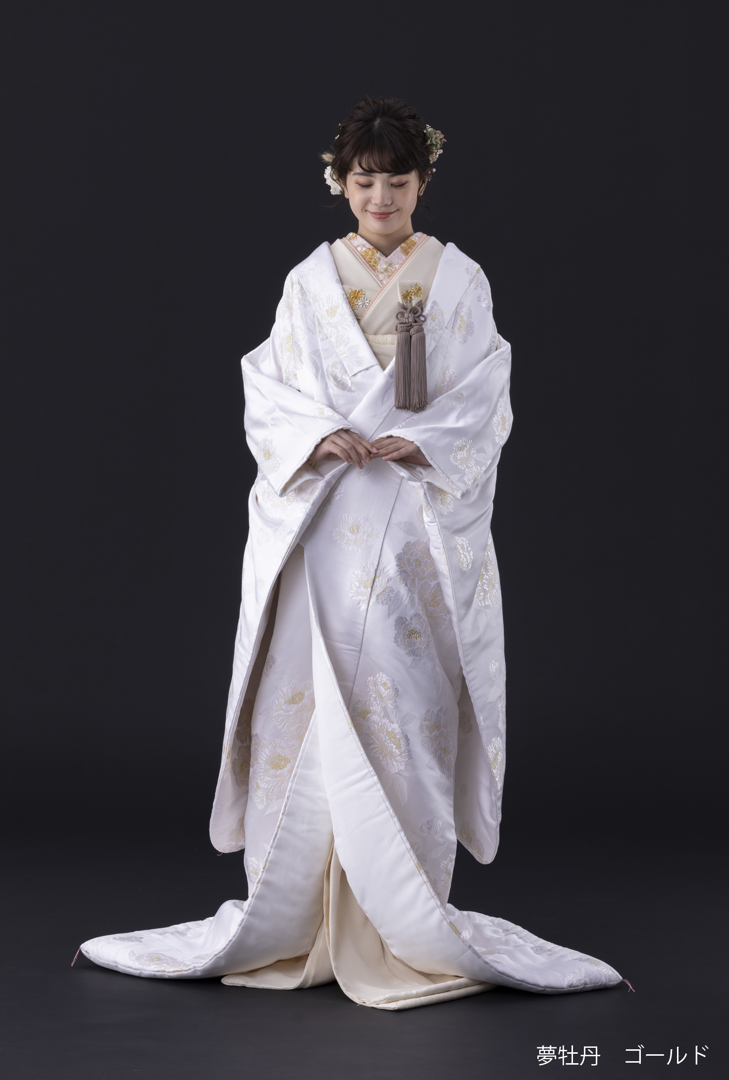 “花王”とも称され富貴の象徴である牡丹。 贅沢にも牡丹だけを配置し、シンプルで美しいデザインに仕上げました。 全体に織り込まれた2色の糸が愛らしい牡丹の花を一層豪華に彩ります。 晴れの日の花嫁様を愛らしく引き立てる西陣織の白無垢です。 |